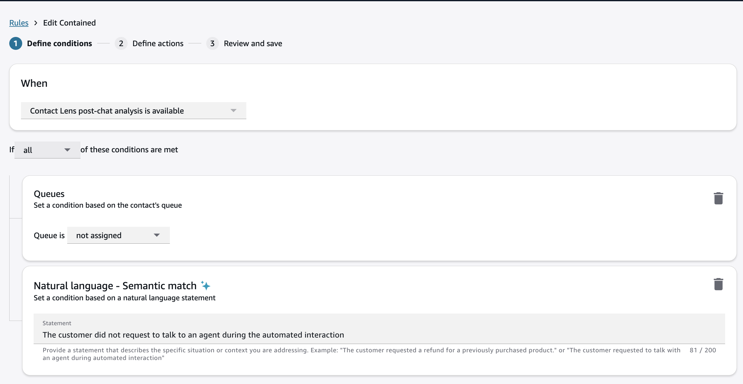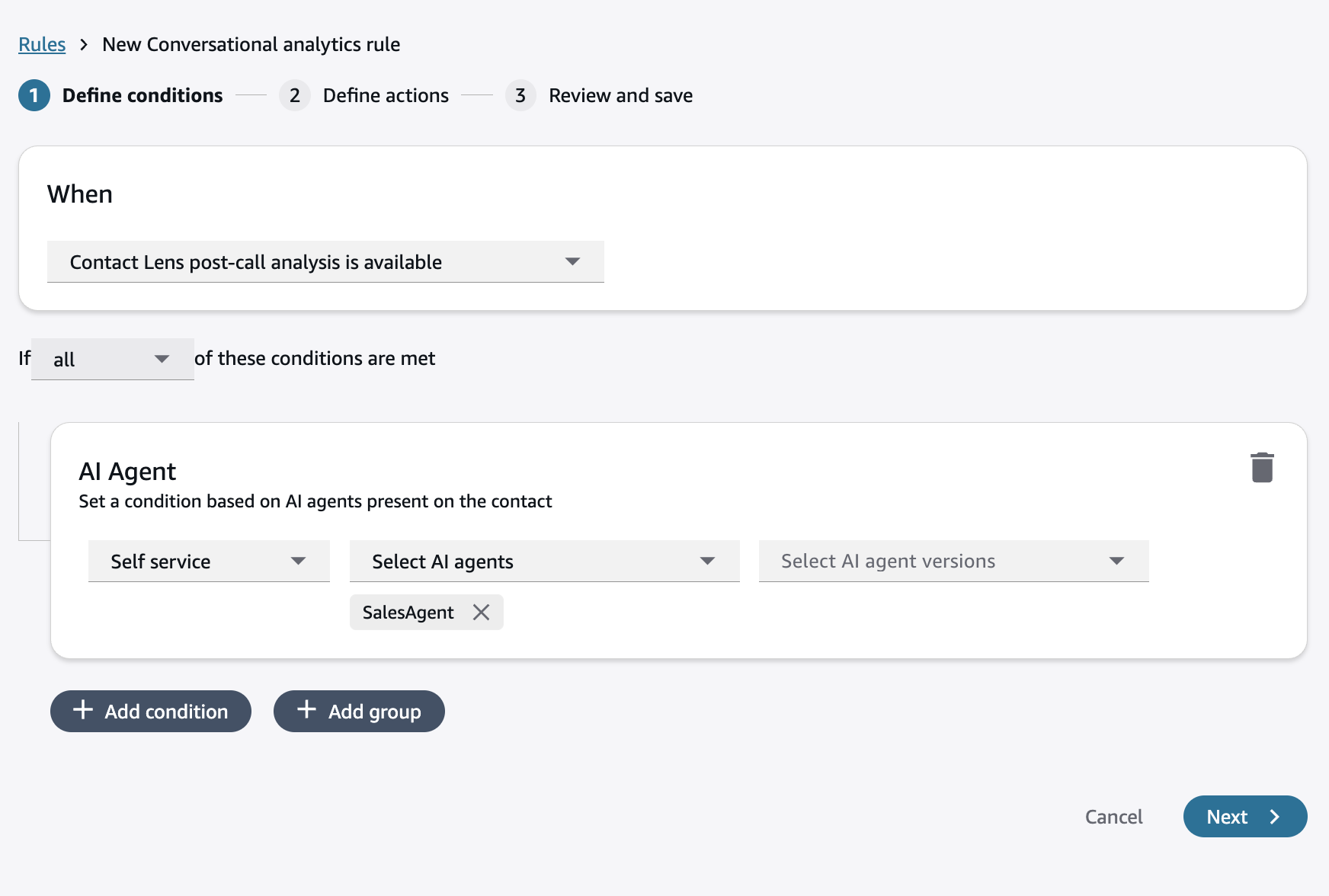 To trigger a self-service interaction evaluation, you can identify if specific AI agent(s) were active on the contact. You can also check for a specific AI agent version.