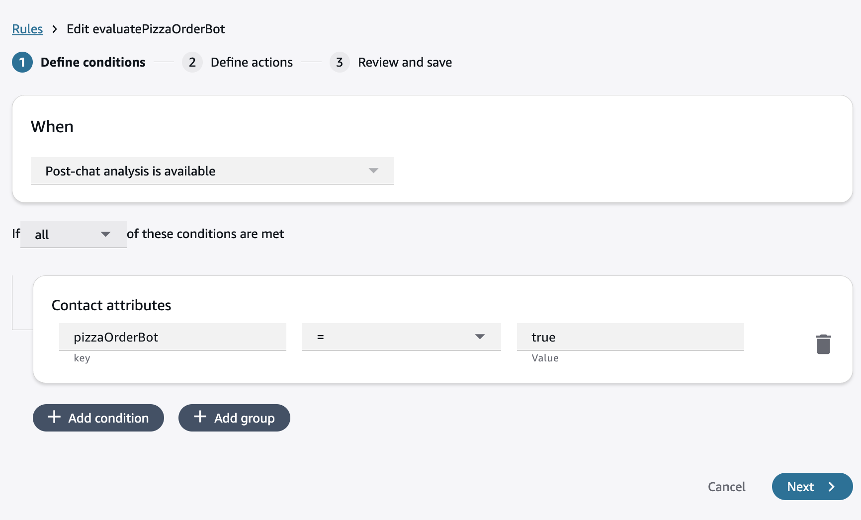 Under When, use the dropdown list to choose post-call analysis or post-chat analysis.
