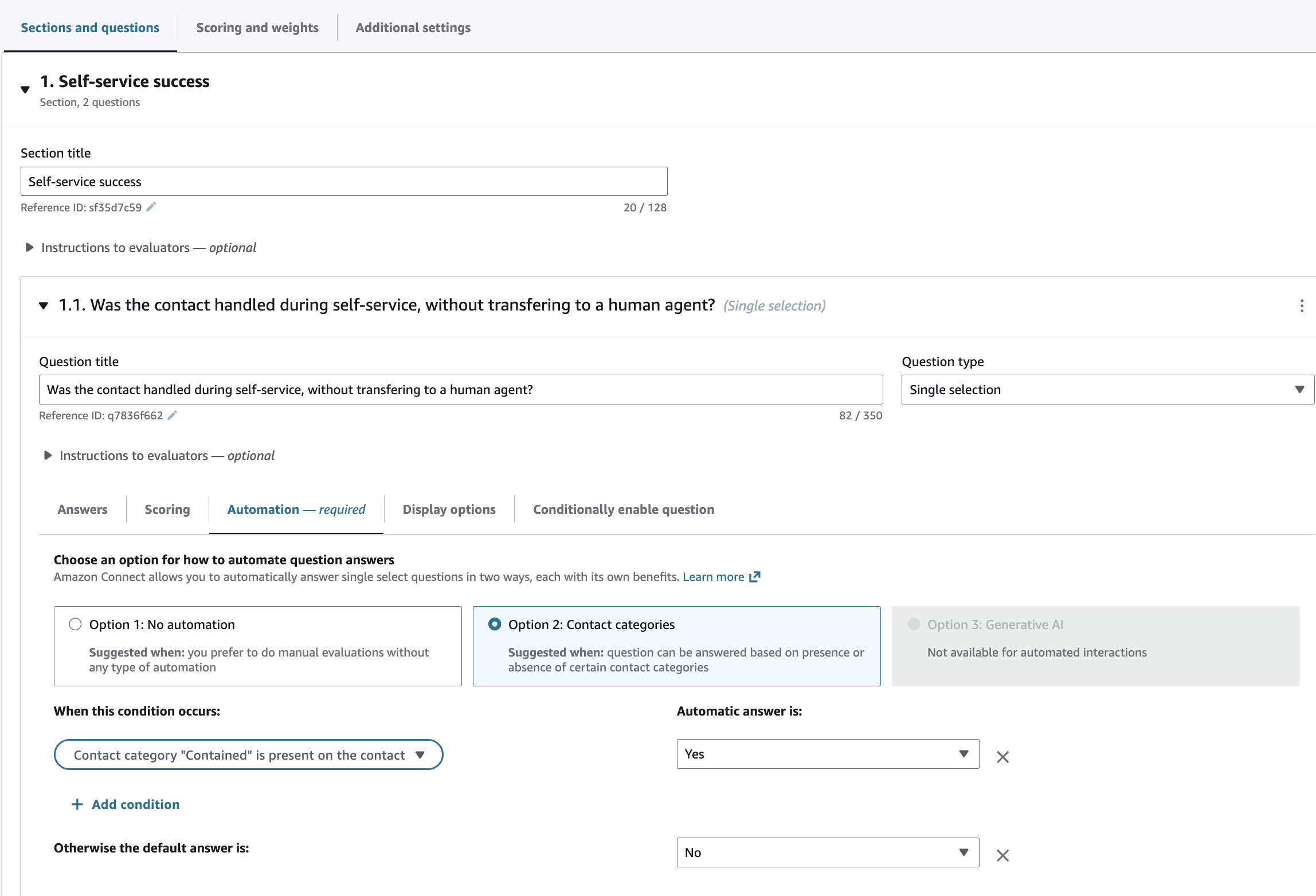 Amazon Connect provides you with the ability to automatically evaluate the quality of self-service interactions and get aggregated insights to improve customer experience. Managers can define custom criteria to assess the quality of self-service interactions, that can be filled manually or automatically using insights from conversational analytics, and other Amazon Connect data. For example, you can automatically assess if the AI agent repeatedly fails to understand the customer, resulting in poor customer sentiment and transfer to a human agent. Managers can review these insights in aggregate and on individual contacts, alongside self-service interaction recordings and transcripts, to identify opportunities to improve bot or AI agent performance.
