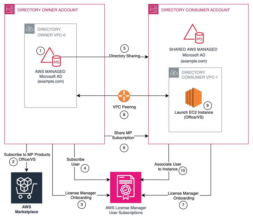 AWS License Manager unterstützt kontenübergreifende Funktionen mithilfe eines gemeinsamen Kontos AWS Managed Microsoft AD, sodass Unternehmen Benutzerabonnements zentral von einem Verzeichnisinhaberkonto aus verwalten und gleichzeitig Instanzen für mehrere Konten bereitstellen können.