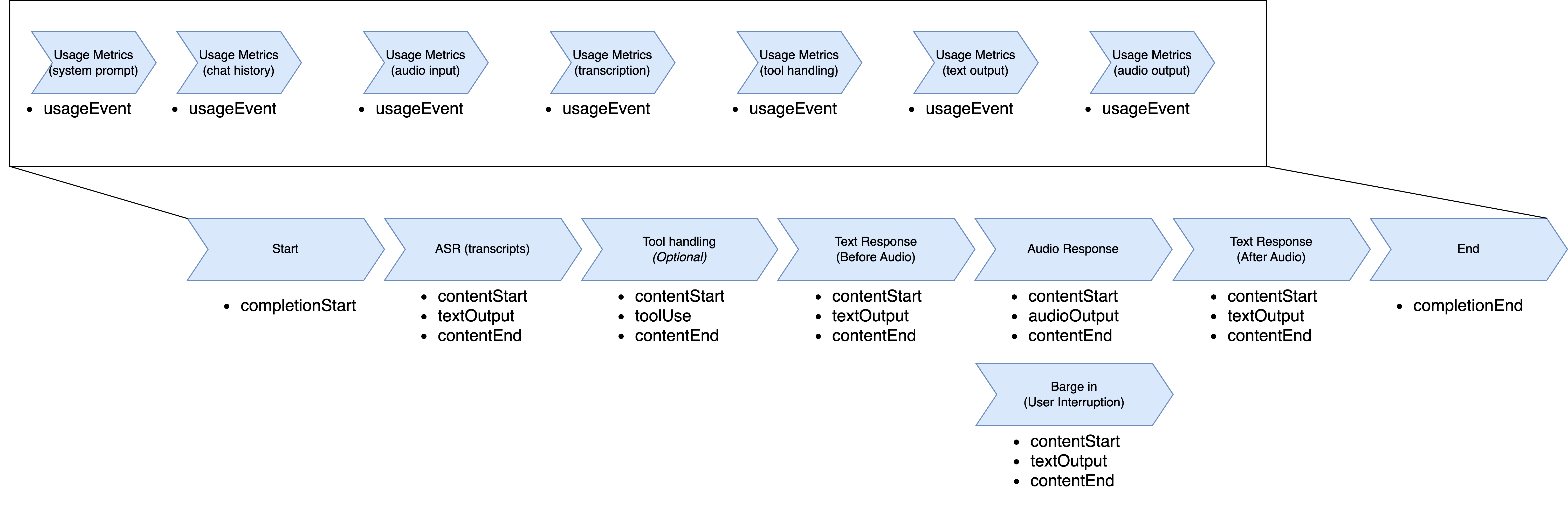 "event": { "usageEvent": { "completionId": "string", // unique identifier for completion "details": { "delta": { // incremental changes since last event "input": { "speechTokens": number, // input speech tokens "textTokens": number // input text tokens }, "output": { "speechTokens": number, // speech tokens generated "textTokens": number // text tokens generated } }, "total": { // cumulative counts "input": { "speechTokens": number, // total speech tokens processed "textTokens": number // total text tokens processed }, "output": { "speechTokens": number, // total speech tokens generated "textTokens": number // total text tokens generated } } }, "promptName": "string", // same unique identifier from promptStart event "sessionId": "string", // unique identifier "totalInputTokens": number, // cumulative input tokens "totalOutputTokens": number, // cumulative output tokens "totalTokens": number // total tokens in the session } }