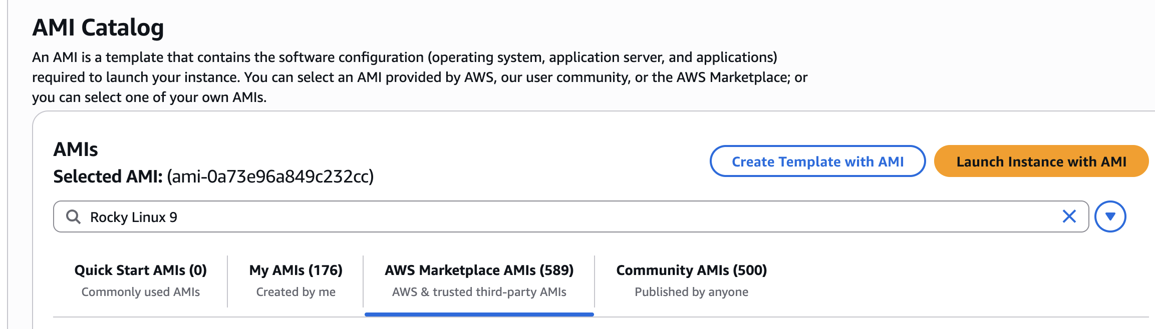 Suchen Sie AMIs unter dem AWS Marketplace-Tab nach dem Namen Rocky Linux 9.