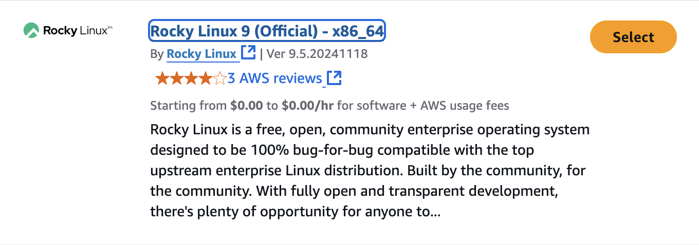 RES hat keinen Standard-Software-Stack für Rocky Linux 9, daher enthält dieser Abschnitt eine Empfehlung, welches Rocky-AMI zu verwenden ist und wie es zu verwenden ist.