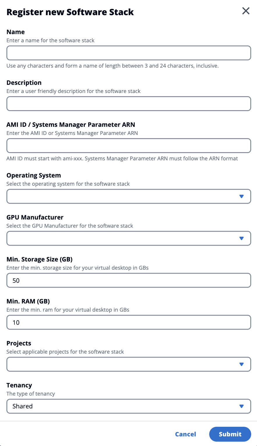 Wenn Sie einen neuen Software-Stack registrieren oder einen vorhandenen Software-Stack bearbeiten, können Sie den Tenancy für den aus diesem Software-Stack VDIs gestarteten auswählen. Die folgenden drei Mietverträge werden unterstützt: