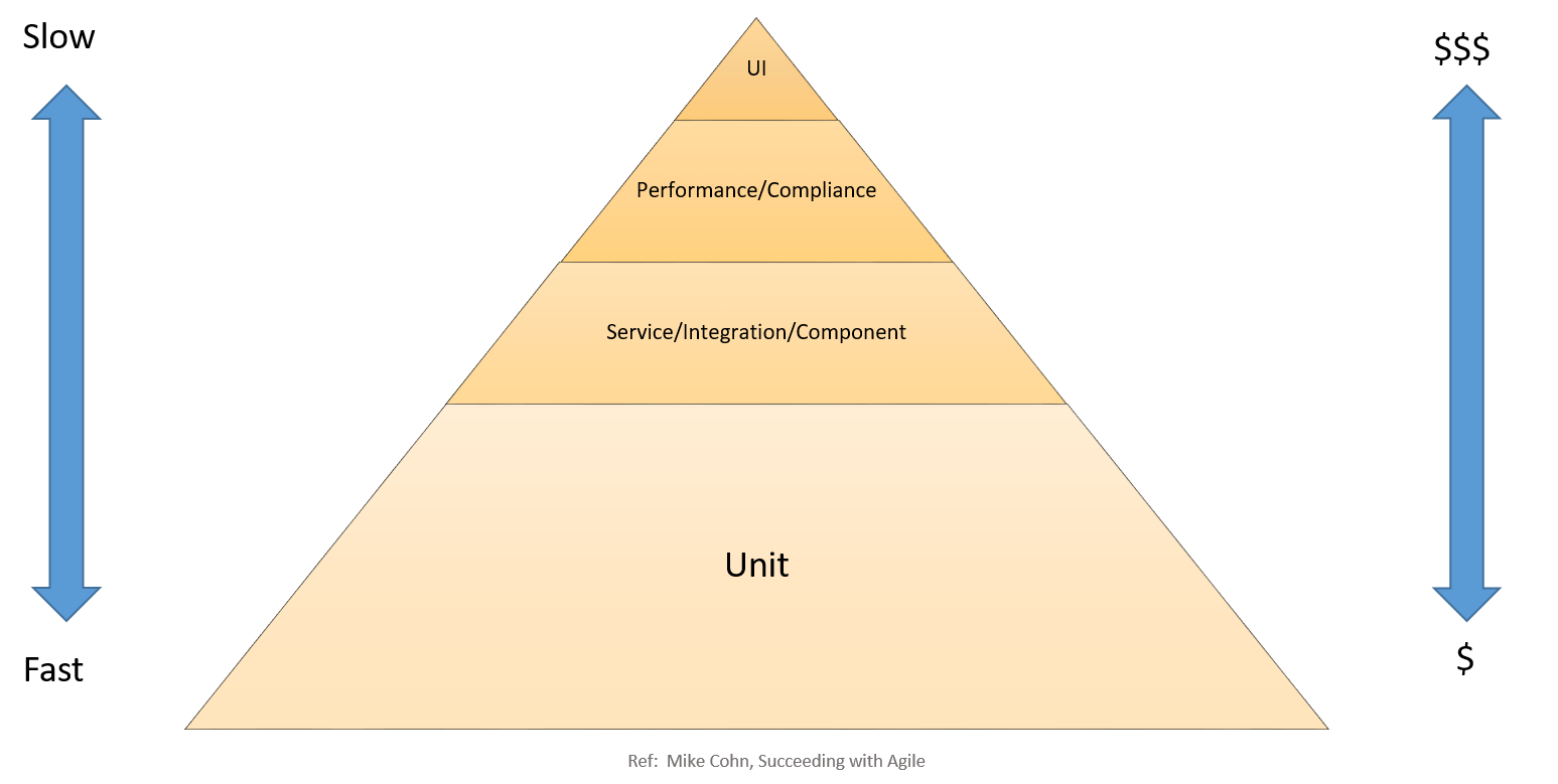 Die drei CI/CD-Teams sollten in den verschiedenen Phasen der CI/CD-Pipeline Tests in den Lebenszyklus der Softwareentwicklung integrieren. Allgemein sollte so früh wie möglich getestet werden. Die folgende Testpyramide ist ein Konzept von Mike Cohn, das er in seinem Buch Succeeding with Agile vorstellt. Sie zeigt die verschiedenen Softwaretests in Bezug auf ihre Kosten und Geschwindigkeit, mit der sie ausgeführt werden.