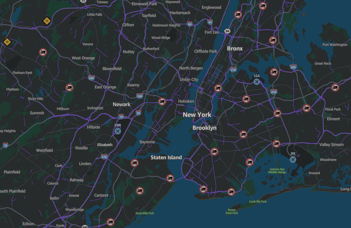 El estilo de mapa estándar ofrece opciones para proporcionar una visualización dinámica diseñada para optimizar la navegación y la planificación de rutas. Los datos de tráfico en tiempo real destacan la congestión, los incidentes y el estado de las carreteras, lo que permite a los usuarios anticipar los retrasos y ajustar sus rutas en consecuencia. Con varios modos de viaje, como el camión o el transporte público, esta función permite a los usuarios seleccionar la opción más eficiente y adecuada al contexto para su ruta, lo que garantiza experiencias de ruta más fluidas e informadas.