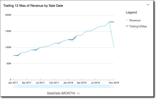 Los resultados de este ejemplo de los últimos 12 meses se muestran en la siguiente captura de pantalla. El campo sum(Revenue) se añade al gráfico para mostrar la diferencia entre los ingresos y los ingresos máximos de los últimos 12 meses.