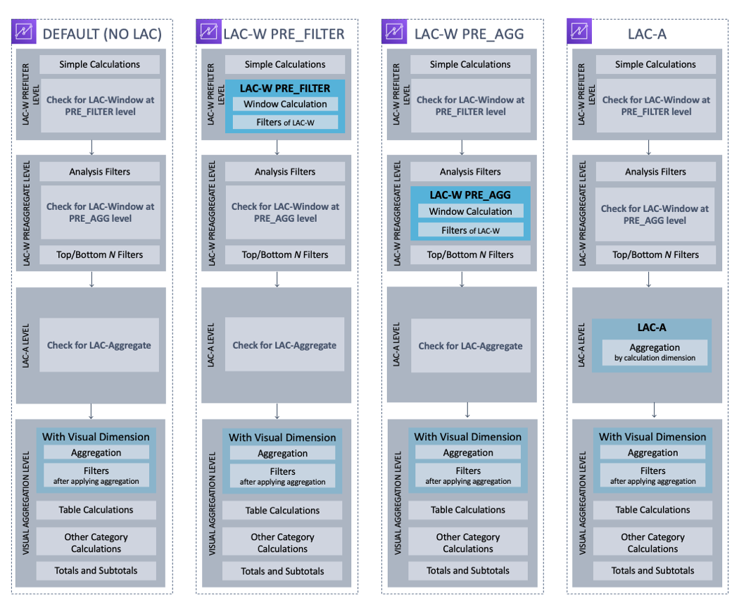 En la siguiente ilustración se muestra el orden de evaluación. La columna de la izquierda muestra el orden de evaluación cuando no hay ninguna ventana de cálculo con reconocimiento de nivel (LAC-W) ni ninguna función de agregación (LAC-A). La segunda columna muestra el orden de evaluación de los análisis que contienen campos calculados para computar las expresiones LAC-W en el nivel de prefiltro (PRE_FILTER). La tercera columna muestra el orden de evaluación de los análisis que contienen campos calculados para computar las expresiones LAC-W en el nivel de preagregado (PRE_AGG). La última columna muestra el orden de evaluación de los análisis que contienen campos calculados para computar las expresiones LAC-A. Según la ilustración, hay una explicación más detallada del orden de evaluación. Para obtener más información sobre los cálculos con reconocimiento de nivel, consulte Uso de cálculos con reconocimiento de niveles en Quick Sight.