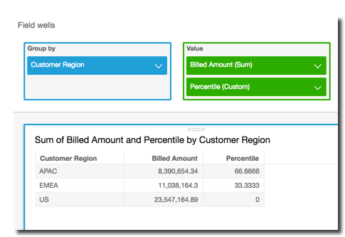 En el siguiente ejemplo se realiza una clasificación de percentil para Customer Region por Billed Amount total. Los campos en el cálculo de tabla se encuentran en los cuadros de campo del elemento visual.