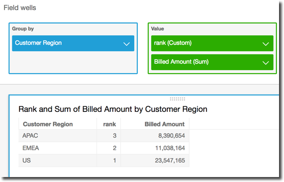 Los resultados del ejemplo se muestran en la siguiente captura de pantalla, junto con el valor de Billed Amount total, para que pueda ver la clasificación de cada región.