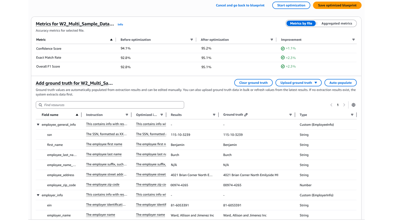 Lorsque vous lancez votre processus d'optimisation, vous fournissez vos exemples d'actifs et les données de base correspondantes, c'est-à-dire les valeurs correctes que vous souhaitez extraire pour chaque champ. L'optimisation des instructions Blueprint compare ces valeurs aux résultats d'inférence et ajuste les descriptions des champs pour améliorer la précision. Une fois l'optimisation terminée, vous recevez des indicateurs de précision qui montrent l'amélioration de la précision, notamment les taux de correspondance exacts et les scores F1 mesurés par rapport à votre réalité de terrain.
