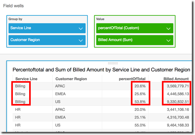 La capture d'écran suivante affiche les résultats de l'exemple. Les mises en surbrillance en rouge montrent que le champ de partition avec la valeur «Billing» possède trois entrées, une pour chaque région. Le montant total facturé pour cette gamme de services est divisé en trois pourcentages, pour un total de 100 %. Les pourcentages sont arrondis et peuvent ne pas toujours donner exactement 100 % une fois cumulés.