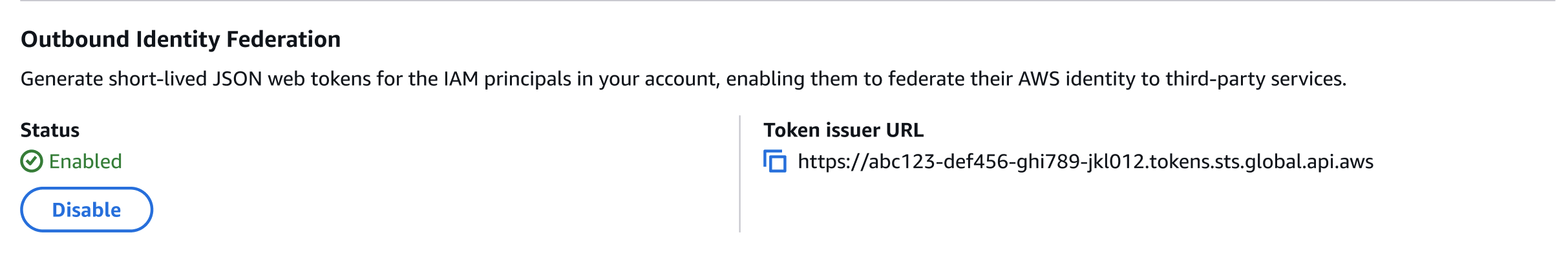 Setelah Anda mengaktifkan fitur ini, catat URL penerbit khusus akun Anda. Anda akan menggunakan URL ini saat mengonfigurasi hubungan kepercayaan di layanan eksternal. Anda juga dapat mengambil URL penerbit ini sesuai kebutuhan menggunakan API. GetOutboundWebIdentityFederationInfo