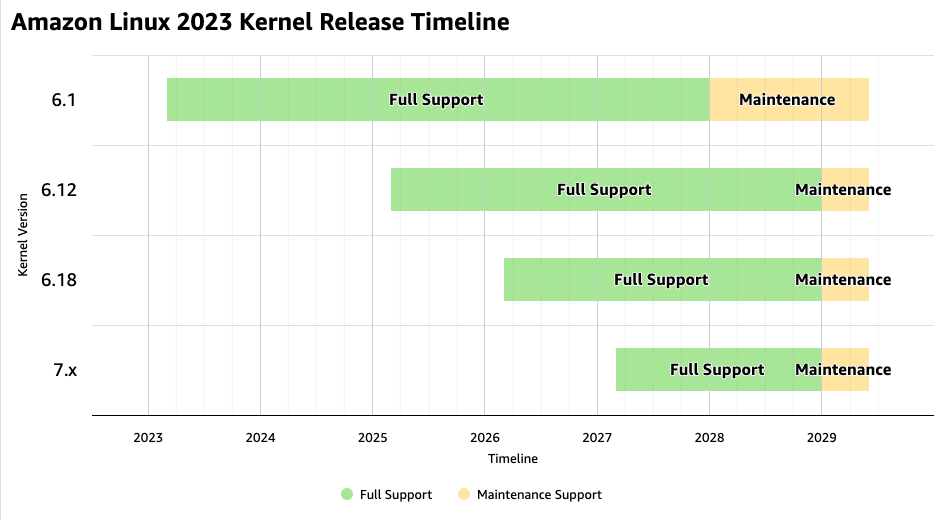 Mulai Juni 2026, AL2023 akan memperbarui kernel default setiap tahun. al2023-ami-kernel-defaultKumpulan AMIs akan diperbarui ke kernel LTS terbaru, sehingga instance yang baru diluncurkan akan muncul dengan versi kernel baru.