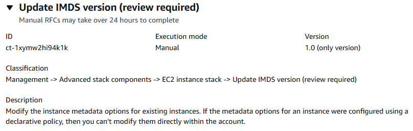 { "ChangeTypeVersion": "1.0", "ChangeTypeId": "ct-1xymw2hi94k1k", "Title": "Update IMDS version" }Buat RFC, tentukan UpdateImdsVersionRfc file dan file: UPdate ImdsVersionParams