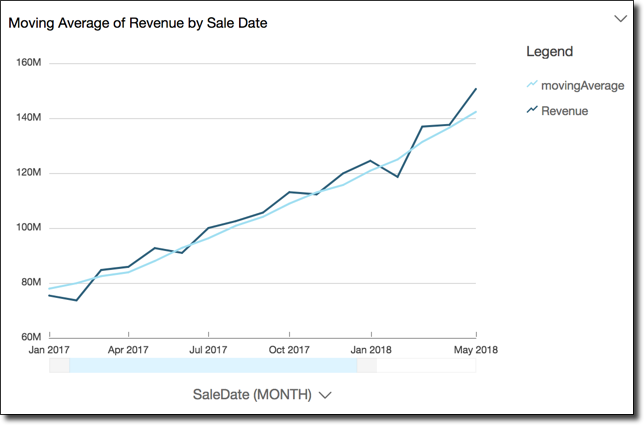 Screenshot berikut menunjukkan hasil dari contoh moving average ini. Bidang jumlah (Pendapatan) ditambahkan ke bagan untuk menunjukkan perbedaan antara pendapatan dan rata-rata pendapatan bergerak.