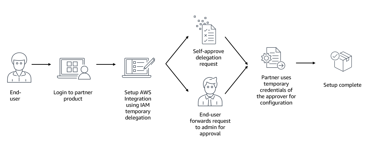 La delega temporanea accelera l'onboarding e semplifica la gestione dei prodotti di Amazon and AWS Partners che si integrano con i tuoi account. AWS Invece di configurare manualmente più AWS servizi, puoi delegare autorizzazioni temporanee e limitate che consentono al fornitore del prodotto di completare le attività di configurazione per tuo conto in pochi minuti attraverso flussi di lavoro di distribuzione automatizzati. Mantieni il controllo amministrativo con requisiti di approvazione e limiti di autorizzazione, mentre le autorizzazioni dei fornitori di prodotti scadono automaticamente dopo la durata approvata senza che sia necessaria alcuna pulizia manuale. Se il prodotto richiede un accesso persistente per le operazioni in corso, il provider può utilizzare la delega temporanea per creare un ruolo IAM con un limite di autorizzazione che definisce le autorizzazioni massime del ruolo. Tutte le attività dei fornitori di prodotti vengono tracciate AWS CloudTrail per il monitoraggio della conformità e della sicurezza.
