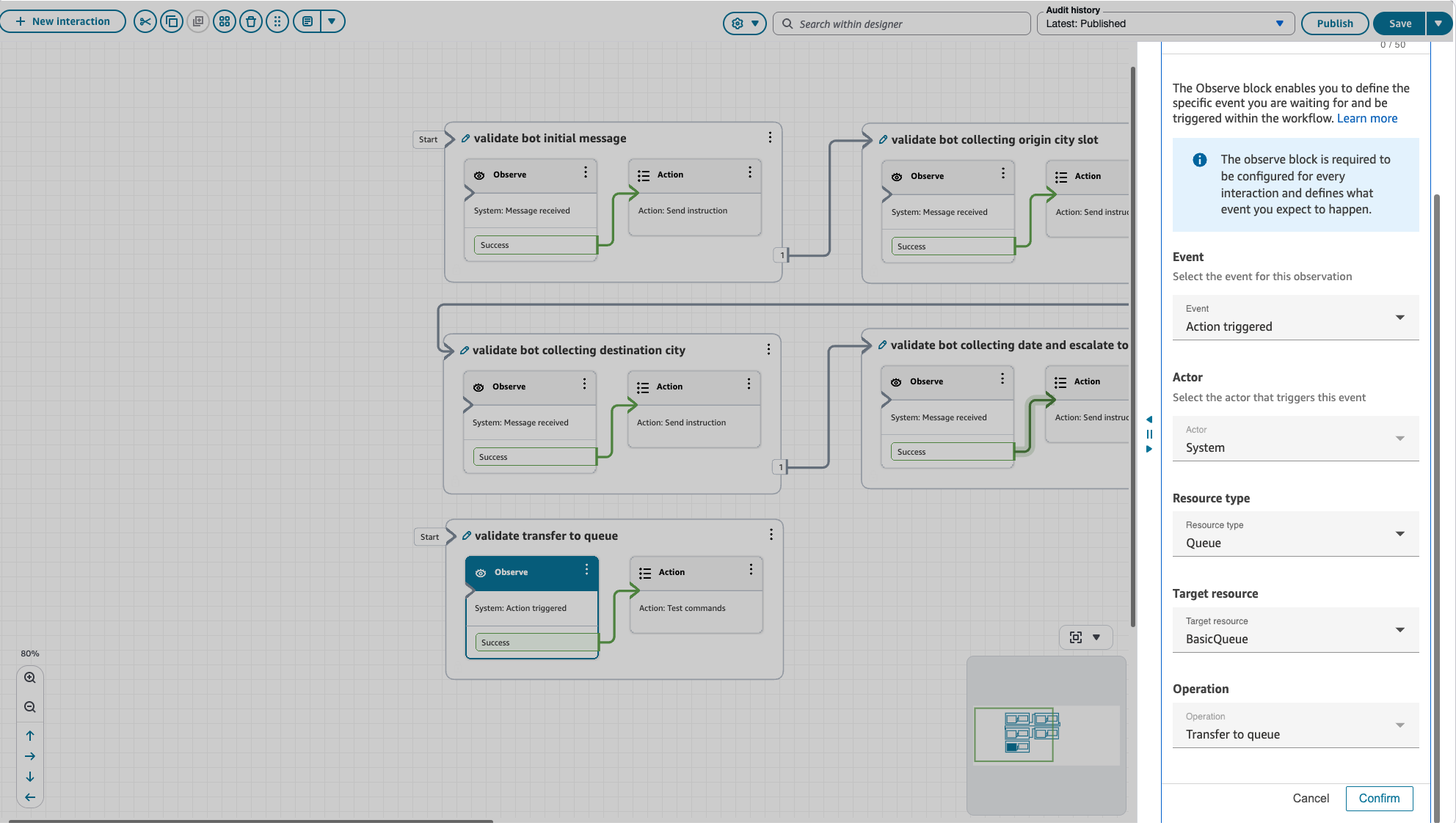 Il gruppo di interazione aperto funziona indipendentemente dagli altri, assicurando che il trasferimento della coda venga convalidato anche se un intento non corrisponde o il bot Lex rileva un errore. Questo perché l'impostazione predefinita del bot Lex e i rami di errore nel flusso di contatti sono entrambi collegati al blocco di trasferimento della coda.