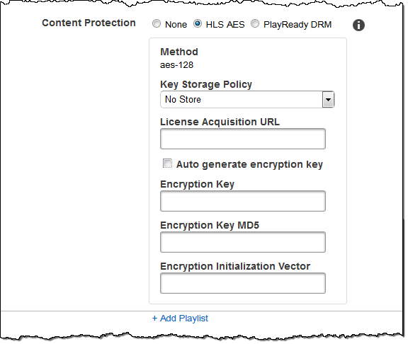 NoStore, Elastic Transcoder non memorizzerà la tua chiave. È tua responsabilità archiviarla e fornirla ai tuoi utenti fornendo loro l'URL di acquisizione della licenza in cui stai archiviando la chiave.