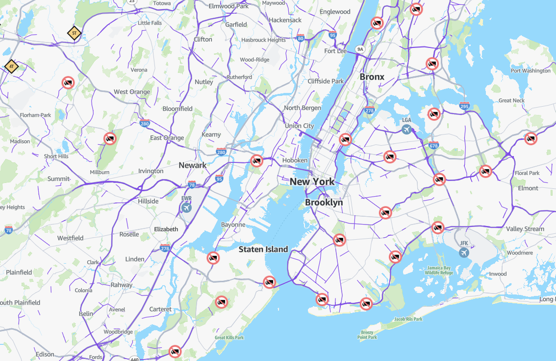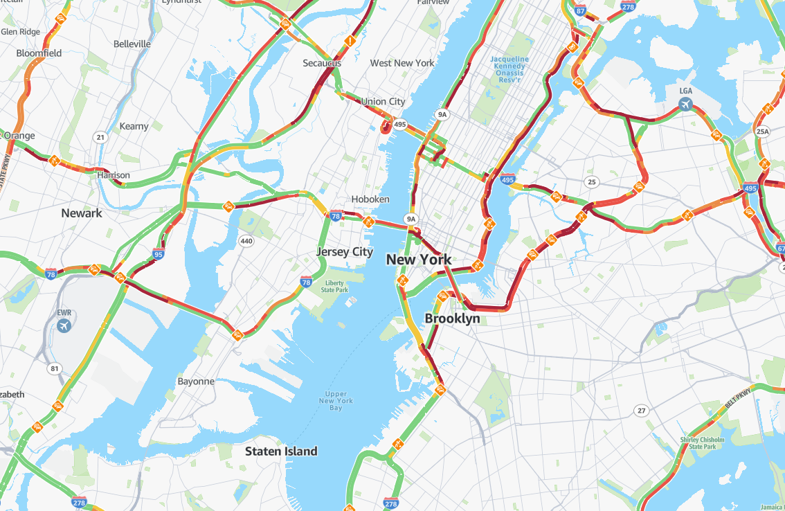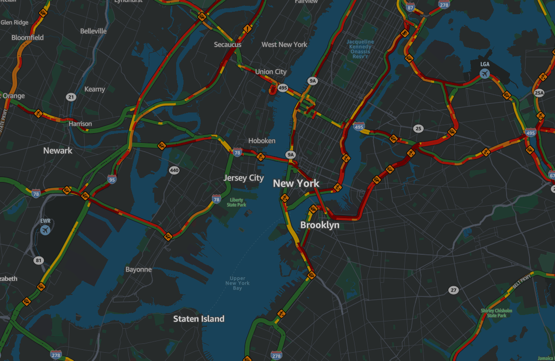 Lo stile di mappa Standard offre opzioni per fornire una visualizzazione dinamica progettata per ottimizzare la navigazione e la pianificazione del percorso. I dati sul traffico in tempo reale evidenziano la congestione, gli incidenti e le condizioni stradali, consentendo agli utenti di anticipare i ritardi e modificare i percorsi di conseguenza. Con diverse modalità di viaggio, come camion o mezzi pubblici, questa funzione consente agli utenti di selezionare l'opzione più efficiente e appropriata al contesto per il loro percorso, garantendo esperienze di percorso più fluide e informate.