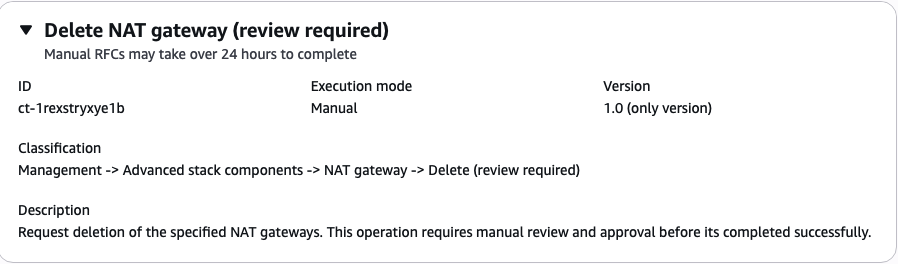 ExecutionParametersJSON devono essere eliminate con una barra rovesciata (\). Esempio:{ "ChangeTypeVersion": "1.0", "ChangeTypeId": "ct-1rexstryxye1b", "Title": "Delete-NAT-Gateway" }Crea la RFC:
