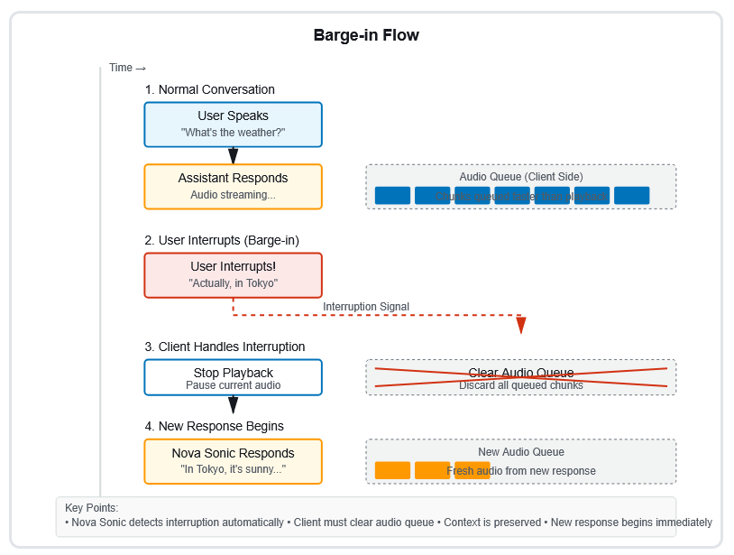 Amazon Nova 2 Sonic è progettato per gestire le interruzioni con garbo. Quando l'utente inizia a parlare durante una risposta, il sistema smette immediatamente di generare la risposta corrente, mantiene il contesto della conversazione completo, invia un segnale di interruzione al client e inizia a elaborare il nuovo input dell'utente.