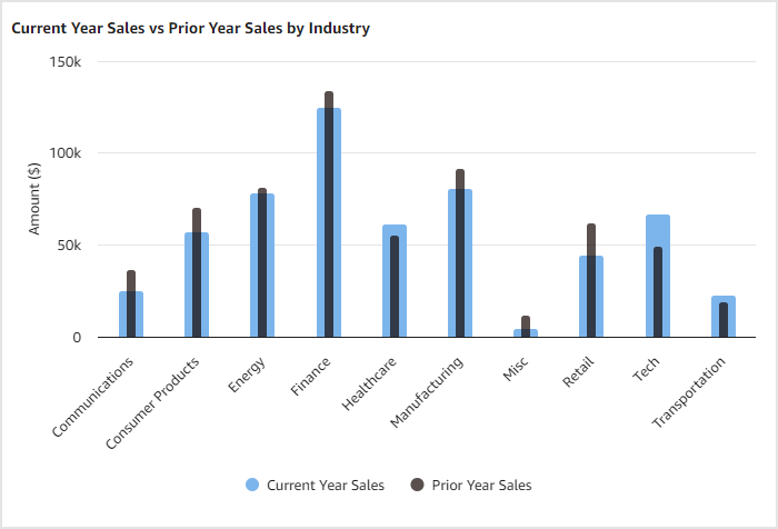{ "xAxis": { "categories": ["getColumn", 0] }, "yAxis": { "min": 0, "title": { "text": "Amount ($)" } }, "tooltip": { "headerFormat": "<span style='font-size:10px'>{point.key}</span><table>", "pointFormat": "<tr><td style='color:{series.color};padding:0'>{series.name}: </td><td style='padding:0'><b>${point.y:,.0f}</b></td></tr>", "footerFormat": "</table>", "shared": true, "useHTML": true }, "plotOptions": { "column": { "borderWidth": 0, "grouping": false, "shadow": false } }, "series": [ { "type": "column", "name": "Current Year Sales", "color": "rgba(124,181,236,1)", "data": ["getColumn", 1], "pointPadding": 0.3, "pointPlacement": 0.0 } ] } -