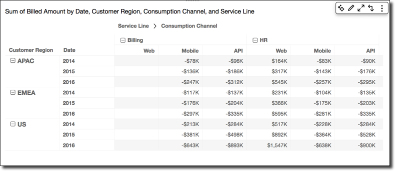 L'applicazione della funzione Percentage Difference (Differenza in percentuale) nelle righe della tabella utilizzando Table across (In senso orizzontale a livello di tabella) per Calculate as (Calcola come) restituisce i seguenti risultati.