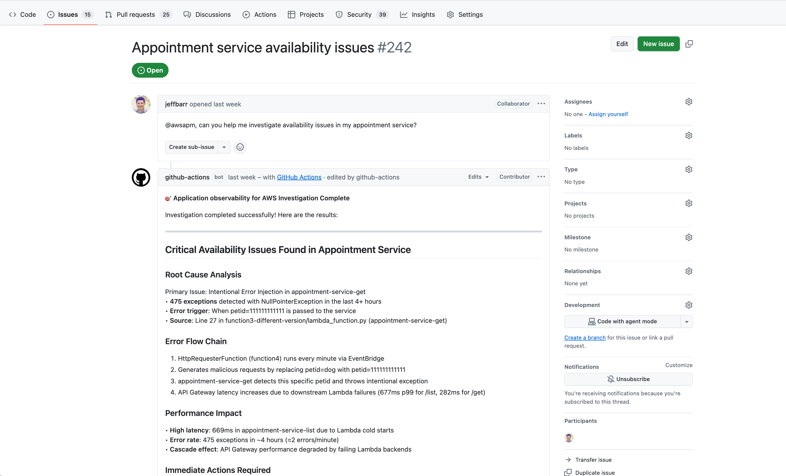 ワークフローの設定が完了したら、GitHub の Issue で @awsapm をメンションし、AI を活用した調査をトリガーします。このアクションはリクエストを分析し、ライブテレメトリデータにアクセスし、推奨事項を提供したり、修正を自動的に実装したりします。