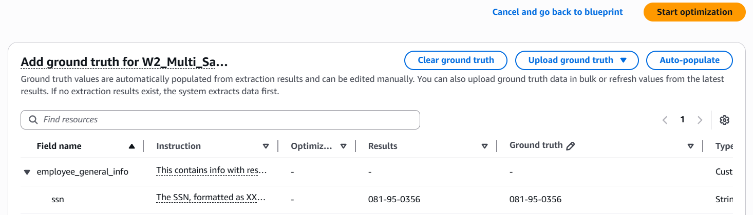 最適化プロセスを開始するときは、サンプルアセットとそれに対応するグラウンドトゥルースデータ、つまり各フィールドに対して抽出する予定の正しい値を指定します。設計図命令の最適化は、これらの値を推論結果と比較し、精度を向上させるためにフィールドの説明を調整します。最適化が完了すると、完全一致率やグラウンドトゥルースに対して測定された F1 スコアなど、精度の向上を示す精度メトリクスを受け取ります。