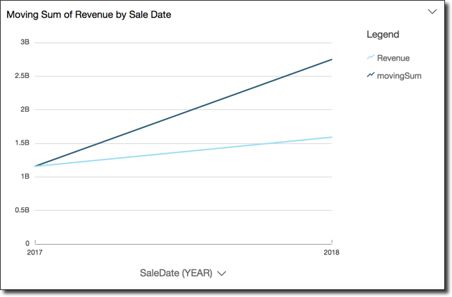 次の例では、sum(Revenue) の移行の合計を計算し、SaleDate でソートします。計算には、現在の行の上 2 行と下 1 行が含まれます。