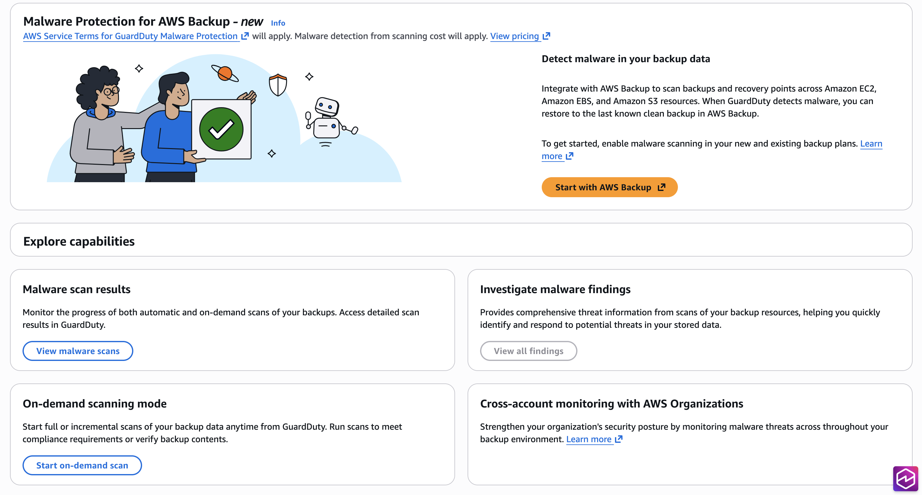 시작하기를 클릭하면 AWS 백업 및 S3 맬웨어 보호 기능을 포함한 옵션 중에서 선택할 수 있습니다.