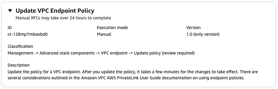 { "ChangeTypeVersion": "1.0", "ChangeTypeId": "ct-128mp7mbxobd0", "Title": "Update VPC Endpoint Policy" }UpdateVPCEndpointPolicyRFC 파일과 UpdateVPCEndpointPolicyParams 파일을 지정하여 RFC를 생성합니다.
