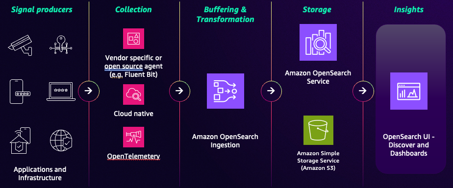 처리 후 데이터는 OpenSearch Service 도메인 또는 컬렉션에 로드됩니다. 거의 실시간으로 방대한 양의 데이터를 저장, 인덱싱 및 분석할 수 있습니다. OpenSearch UI의 관찰성 워크스페이스와 같은 시각화 인터페이스를 통해이 데이터와 상호 작용하여 쿼리를 실행하고 대시보드를 빌드하며 알림을 설정합니다.