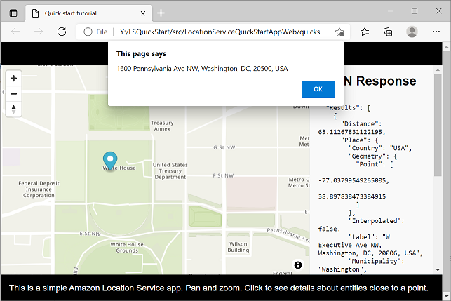 tells Amazon Location to return only a maximum of five results.The remaining code checks for an error, and then displays the results of the search in the