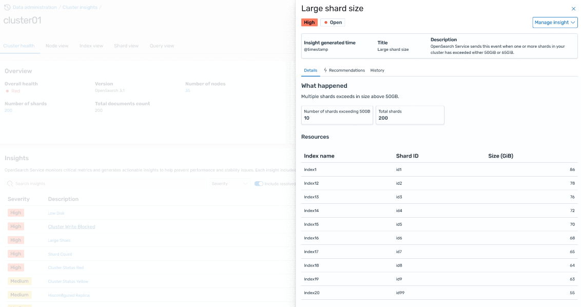 Each insight in the Top insights by severity section is interactive and provides detailed analysis. For example, when you choose the Large Shard Size insight:
