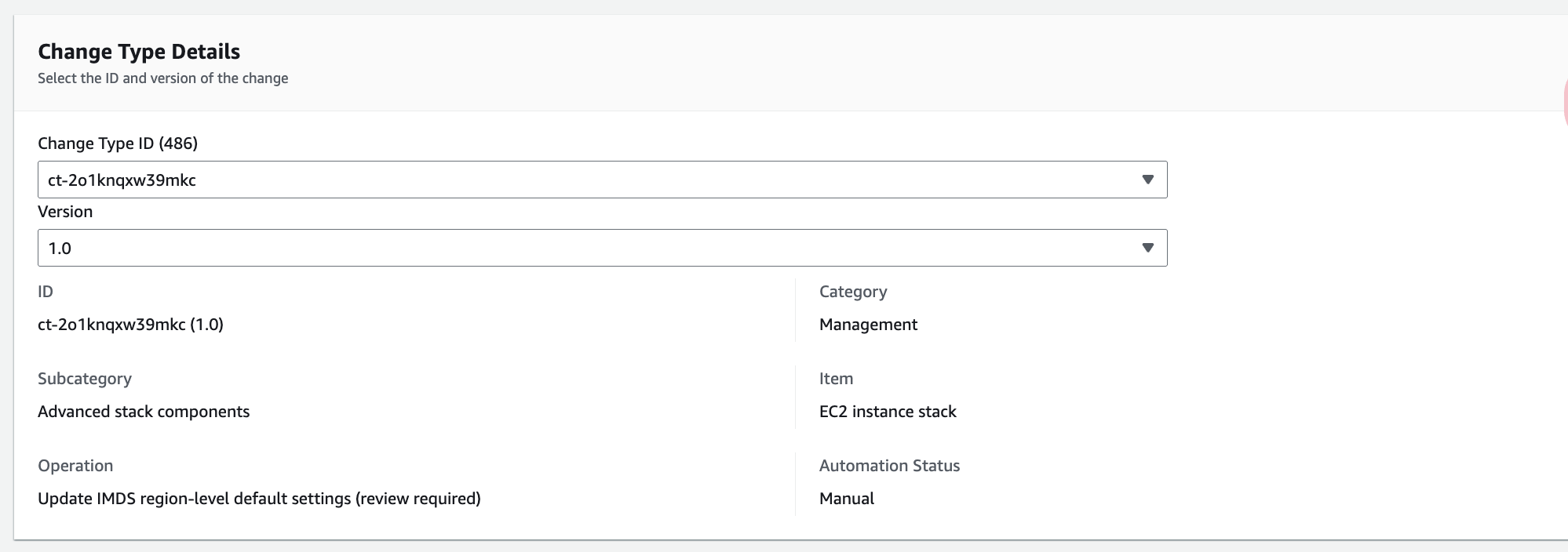 aws amscm create-rfc --change-type-id "ct-2o1knqxw39mkc" --change-type-version "1.0" --title "Update IMDS region-level default settings" --execution-parameters "{\"Region\":\"us-west-2\",\"HttpEndpoint\":\"Enabled\",\"HttpTokens\":\"Required\",\"InstanceMetadataTags\":\"Enabled\",\"HttpPutResponseHopLimit\":1,\"Priority\":\"High\"}"